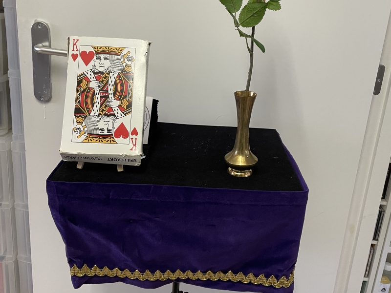 Stel voor, voor je volgende truc heb je een tafel nodig, en dat is handig, deze staat al klaar. Hij staat alleen nog op de verkeerde plek. Je tilt de tafel op en op het moment dat je zelf wilt valt een van de voorste 2 poten met veel lawaai onder de tafel uit, net als je met je ene hand de poot wilt opraken maar er niet bij kunt valt een 2e poot onder de tafel uit. Tsja, hoe gaan we dat oplossen? Dan plotseling klappen er twee prachtige vrouwenbenen onder het tafelblad uit welke de tafel verder ondersteunen.